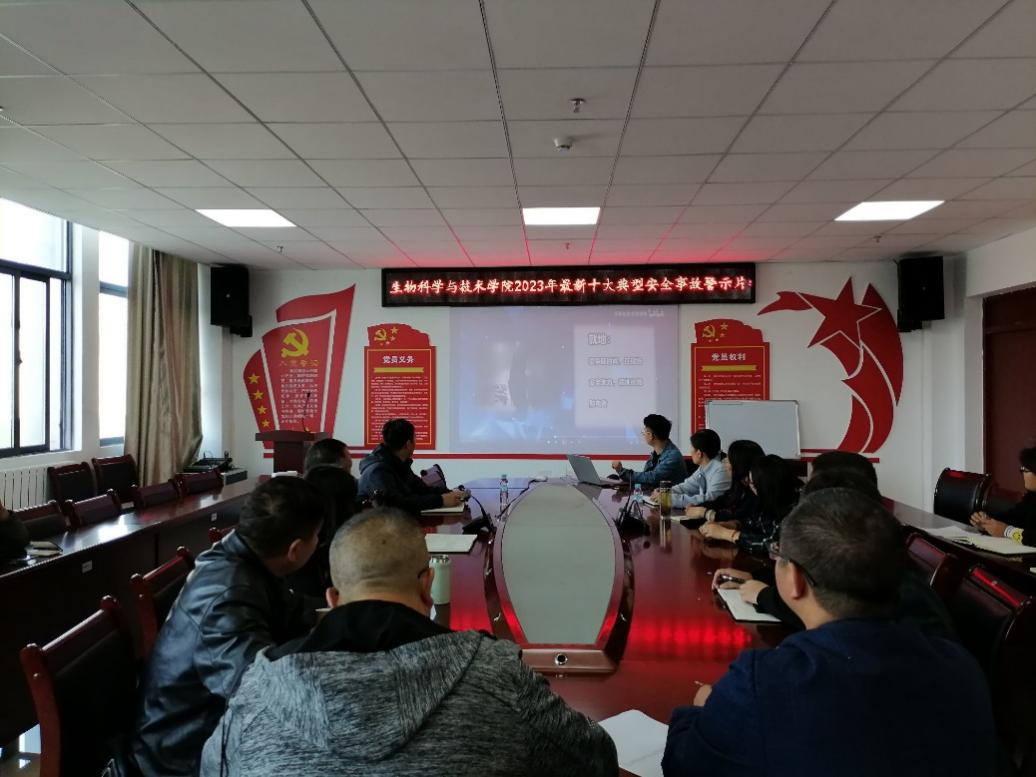 用事故教训推动安全责任落实,全面加强安全防范工作。为进一步提高安全防范意识和应急处理能力,生物科学与技术学院于11月6日组织教师观看了《2023年新版十大典型安全事故警示片》。警示片选取近年来各地发生的重大和较大典型事故案例,展示了触目惊心的画面和震越人心的事实,具有深刻的警示教育意义。