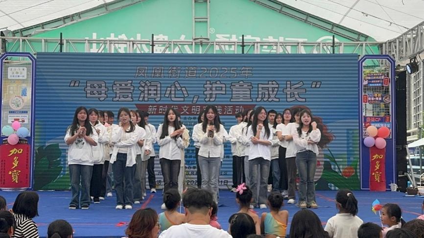 5月11日下午,生物科学与技术学院植物科学与技术专业2024级团支部赴凤凰街道参加“2025年母爱润心,护童成长”新时代文明实践活动。在凤凰街道办事处组织下,团支部成员作为志愿者在舞台上合唱《童年》,展现青春风采。
