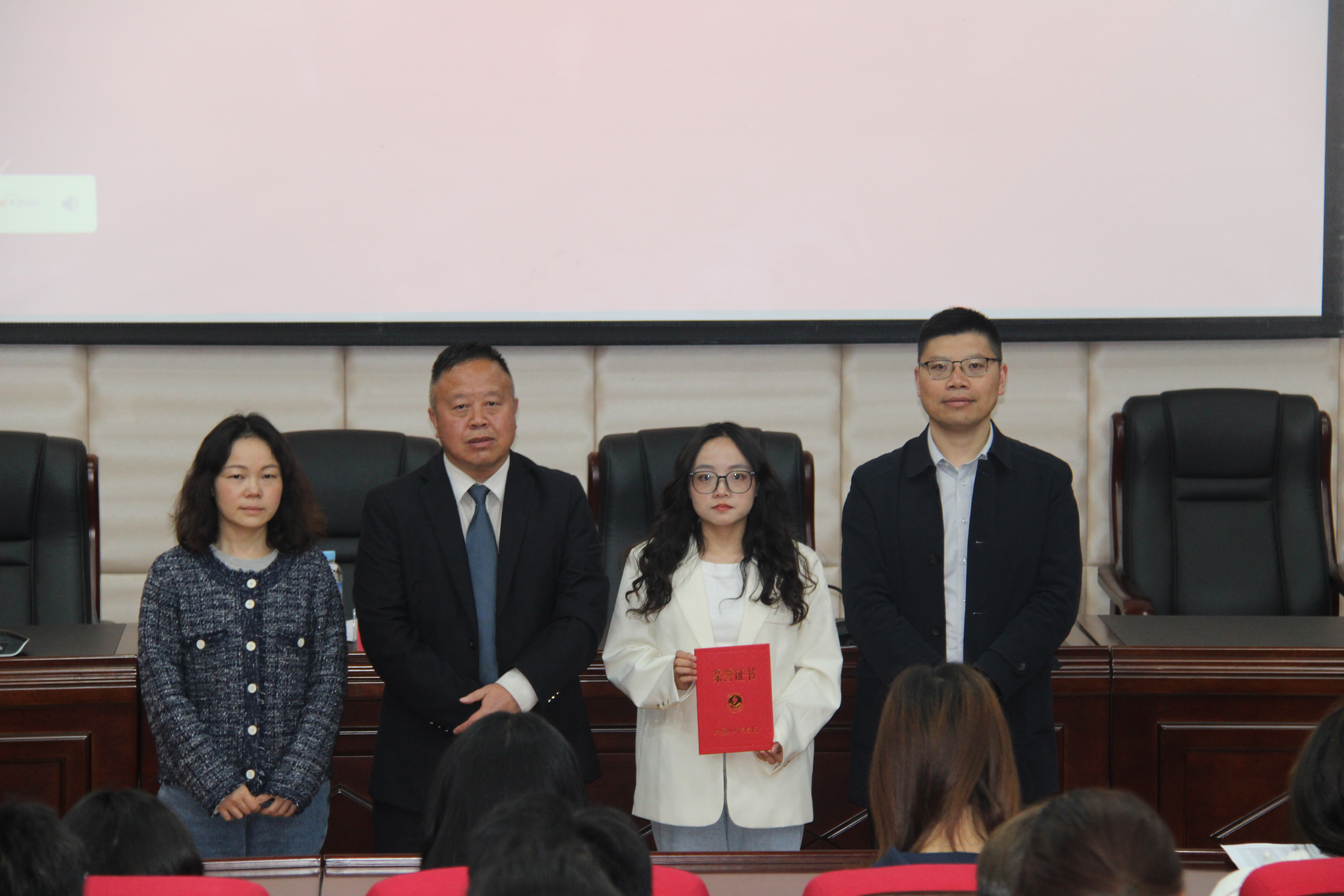 王家理、熊荣川、方玉梅分别宣读获奖名单并向受表彰学生颁发荣誉证书。考研学生代表朱楚玉作考研经验分享。