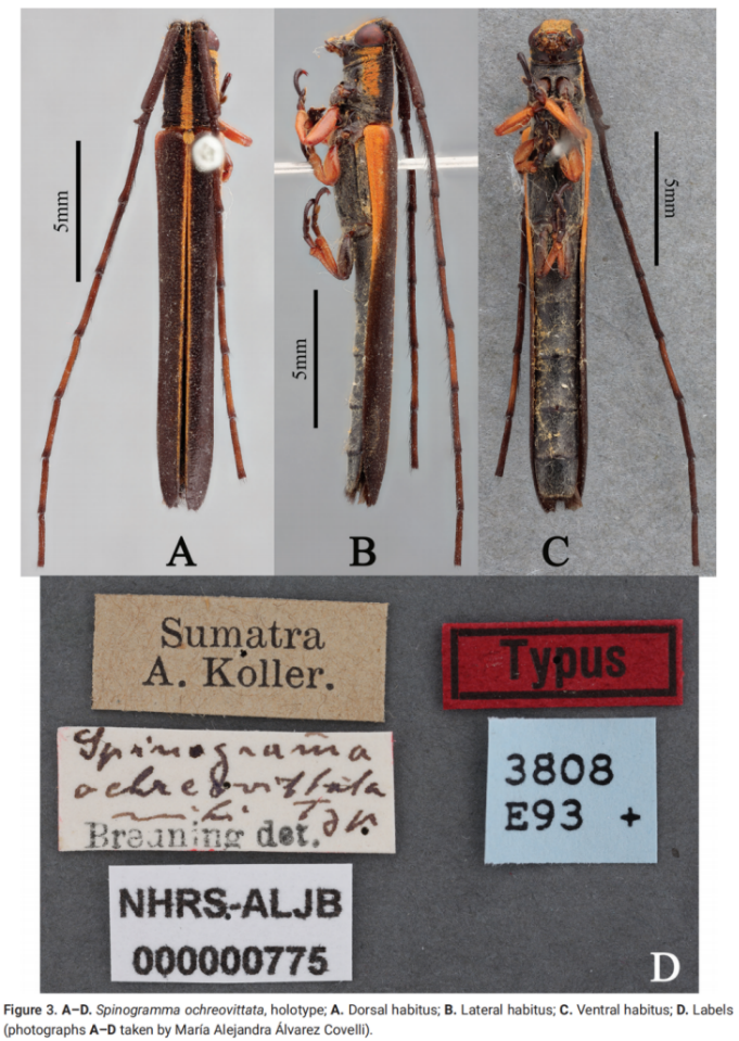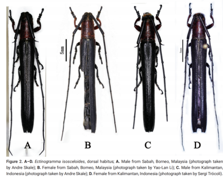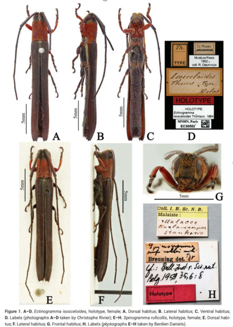 该论文对艾克天牛属Ectinogramma进行了修订,提出了艾克天牛属的一个次异名:脊线天牛属Spinogramma Breuning, 1947和等足艾克天牛Ectinogramma isosceloides Thomson, 1864(图1 A-D,2 A-D)的一个次异名:红颈脊线天牛Spinogramma ruficollis Breuning, 1959(图1 E-H)以及提出了一个分类学新组合赭带艾克天牛Ectinogramma ochreovittata (Breuning, 1947)。确定了等足艾克天牛,后颈艾克天牛E. collare Pascoe, 1866和红颈脊线天牛的模式标本的性别,首次发现等足艾克天牛的雄性并新增了分布地。(供稿/黄贵强团队 编辑校对/陈金龙 李婉雪 彭丽 审核/王家理)