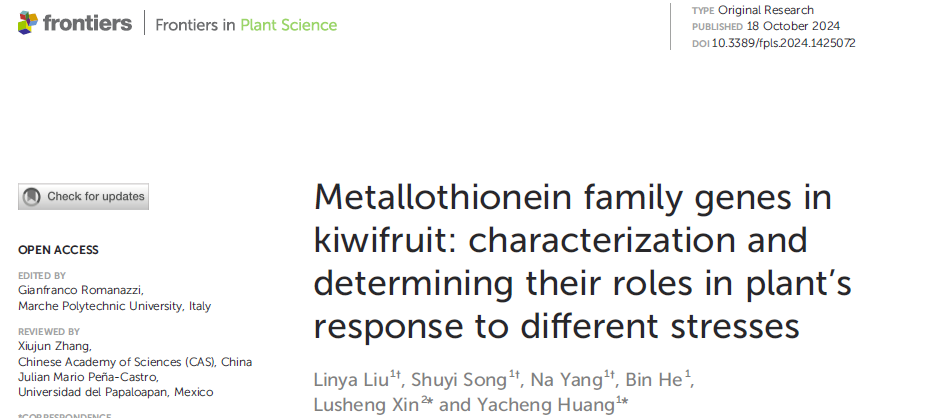 2024年10月,bat365生物科学与技术学院刘林娅副教授作为第一作者,黄亚成副教授作为通讯作者的研究论文。《Metallothionein family genes in kiwifruit: characterization and determining their roles in plant's response to different stresses》在国际植物科学领域知名期刊《Frontiers in Plant Science》(JCR Q1区,中科院二区TOP)上正式发表。
