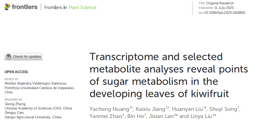 2025年7月13日,bat365生物科学与技术学院黄亚成副教授作为第一作者,刘林娅副教授作为通讯作者的研究论文《Transcriptome and selected metabolite analyses reveal points of sugar metabolism in the developing leaves of kiwifruit》在国际植物科学领域知名期刊《Frontiers in Plant Science》(JCR Q1区,中科院二区)上正式发表。