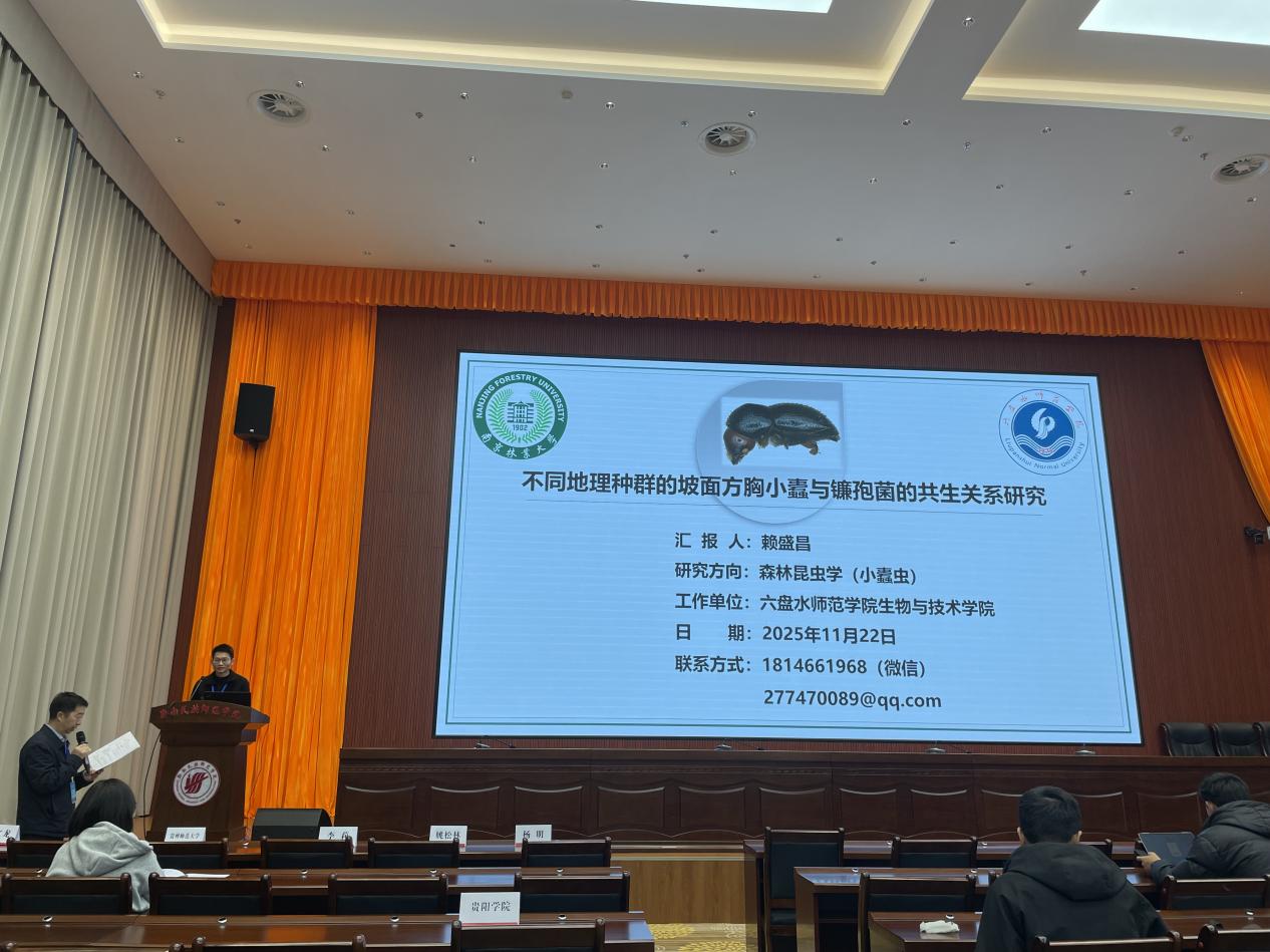 2025年11月21-23日,我院苏成元、赖盛昌和黄贵强三位老师前往都匀市参加由贵州省昆虫学会主办,黔南民族师范学院和贵州大学昆虫研究所承办的“贵州省昆虫学会2025年学术年会”。苏成元老师作了题为“六盘水地区蝴蝶种群中Wolbachia专性WO噬菌体的超级感染及其orf7基因重组模式研究”的大会报告,赖盛昌老师作了题为“不同地理种群的坡面方胸小蠹与镰孢菌的共生关系研究”的大会报告。(供稿/黄贵强 编辑校对/尚雪英 王雪雪 审核/王家理)