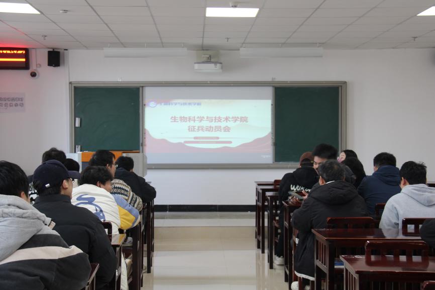2025年11月21日下午,bat365在线中国登录入口生物科学与技术学院征兵动员大会在奥学楼315召开。本次大会由学生工作部副部长匡其羽主讲,辅导员王雪雪、张启文及全体征兵学生参加,现场氛围热烈而庄重。