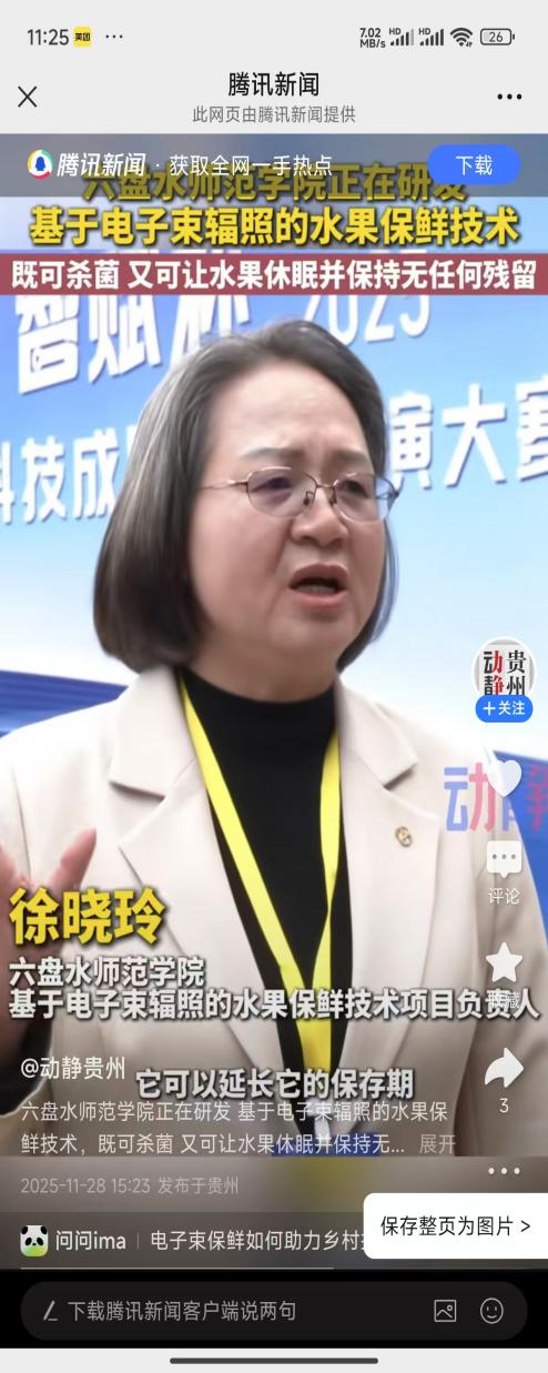 11月29日,我院教师徐晓玲博士团队的研究成果“基于电子束辐照的水果保鲜技术研究及产业化应用”参加了贵州省第二届“智赋杯”比赛,成果获得评委专家好评,并接受了贵州电视台采访。
