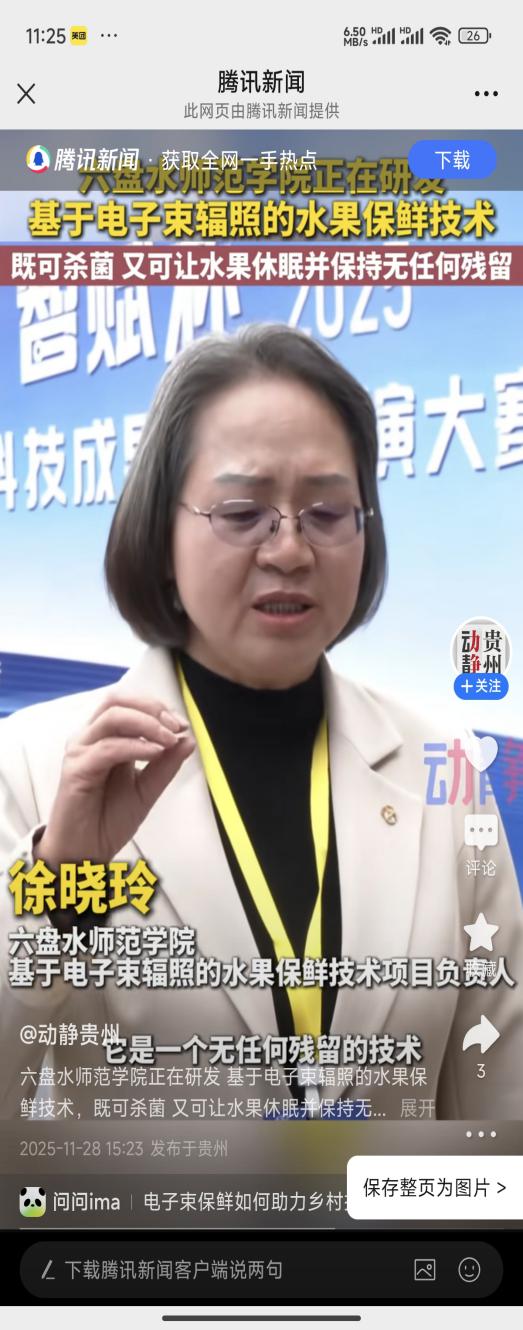徐晓玲博士研究团队还致力于将电子束辐照技术应用于贵州刺梨、水城羊肉粉、贵州二黄姜的保鲜贮藏,降低烂腐率、延长保质期,研究团队还积极联合相关企业推进电子束辐照技术在贵州的产业化应用,以科技赋能“黔货出山”,助力乡村振兴。(供稿/徐晓玲 编辑校对/尚雪英 王雪雪 审核/王家理)