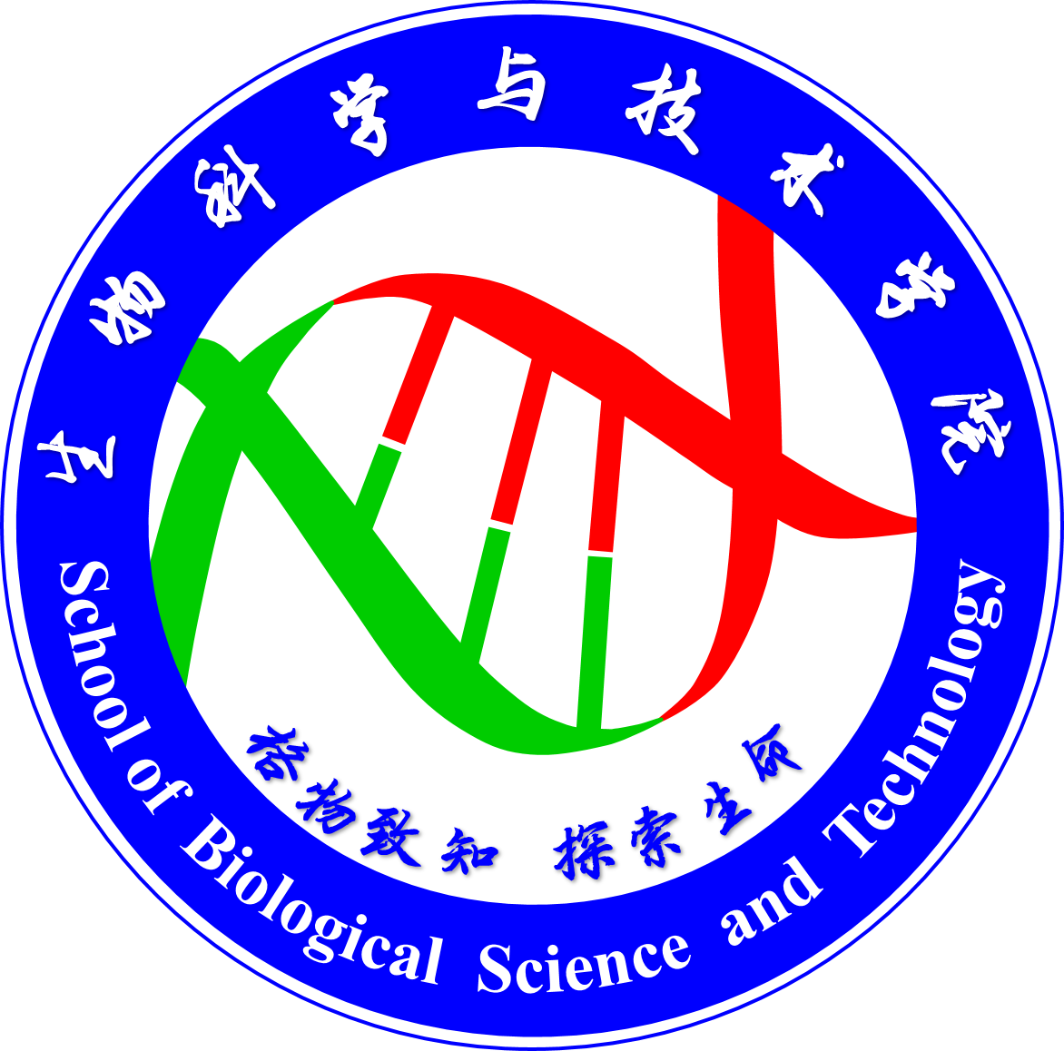 【院徽简介】生物科学与技术学院院徽中央为生命基本遗传物质DNA双螺旋结构概念图;双螺旋上半部分的鲜红色代表生命,下半部分的绿色喻示大自然生生不息;螺旋中央交汇形成探索自然奥秘的“生命之眼”,边缘的天蓝色寓意师生对科学真理的探索。格物致知,探索生命奥秘无止境,体现了我院核心的办学理念。