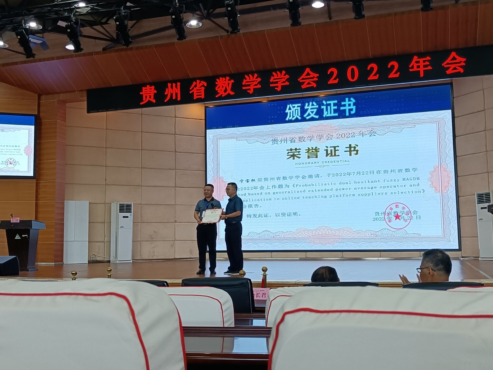 此次会议,宁宝权院长被选为贵州省数学会常务理事,并被邀请做了大会报告,他从概率对偶犹豫模糊集目前研究中存在的问题出发,分析了关于概率对偶犹豫模糊集需要进一步探讨的问题,针对概率对偶犹豫模糊元的距离测度、得分函数以及权重确定方法等方面提出了一些新的观点,同时研究了能够处理决策属性间存在相关关系的概率对偶犹豫模糊集结算子,提出了概率对偶犹豫模糊环境下新的集结算子,并对集结算子的一些优良性质、特殊形式进行了详细的研究,基于新的集结算子提出了新的多属性群决策方法,并应用于在线教学平台供应商选择案例中,通过参数的敏感性分析以及与其他存在的方法的对比分析,进一步说明了提出的集结算子的灵敏性和有效性,且与参会人员进行了深入探讨,引起了与会专家学者的浓厚兴趣,并得到了一致好评。(供稿/杨应明 编辑校对/陈先康 审核/杨光强)