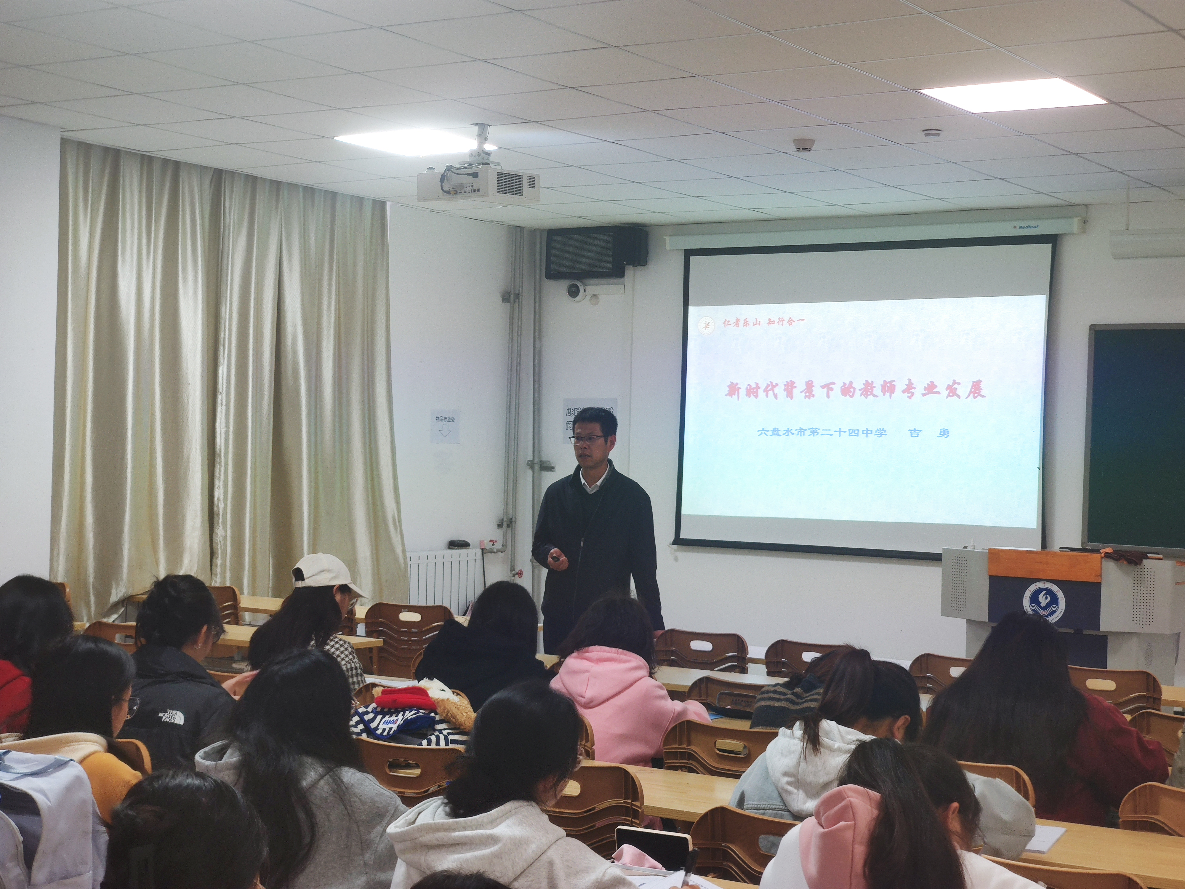 讲座中,吉勇校长首先介绍了六盘水市第二十四中学“仁”文化的教学理念和“351”的教学模式。随后,他从“怎样成为合格的人民教师”出发,带领同学们深入思考了“知识学习等于教育吗”“教育的内涵与使命是什么”“什么是真正的素质教育”等教育问题。他指出一名合格的教师需要有职业道德、有知识、有思想、有境界。最后,吉勇校长就“怎样上一节有质量的课”和“怎样提升教师自身素养”两个问题,结合具体案例,进行了深入浅出的讲解,为同学们专业发展指明了方向。