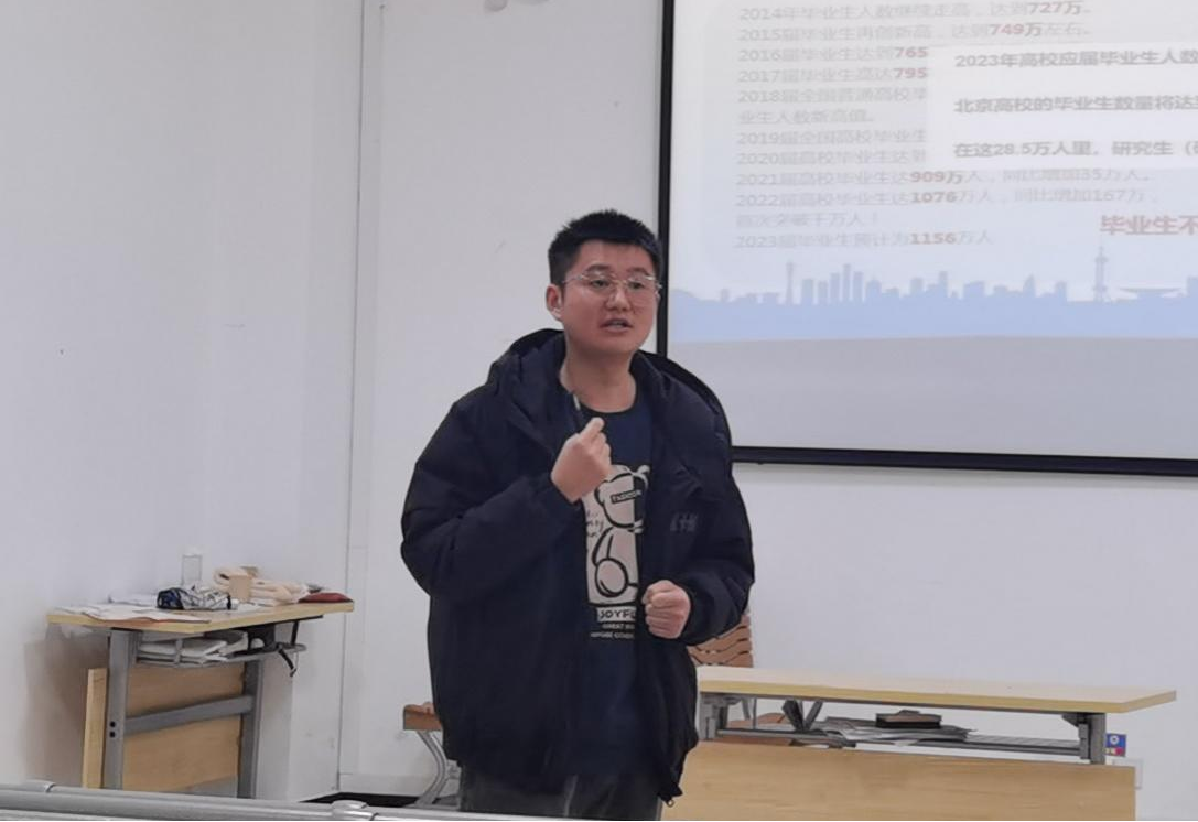 接着,由辅导员雷飘老师对当前国家整体就业形势以及我院往届毕业生的就业情况进行分析。同时,他还从如何参加春招、秋招以及如何利用各求职网站等方面给同学们进行具体的就业指导。