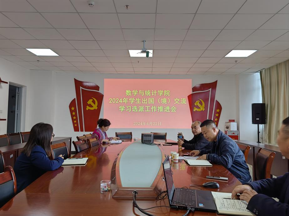 4月22日下午,在奥学楼521会议室,数学与统计学院召开2024年学生出国(境)交流学习选派工作推进会。会议由院长宁宝权主持,学院党委书记杨光强、党委副书记张华伟出席、党政办公室主任杨应明、学生科科长唐艳飞、教学科研管理课田凤娟参加会议。