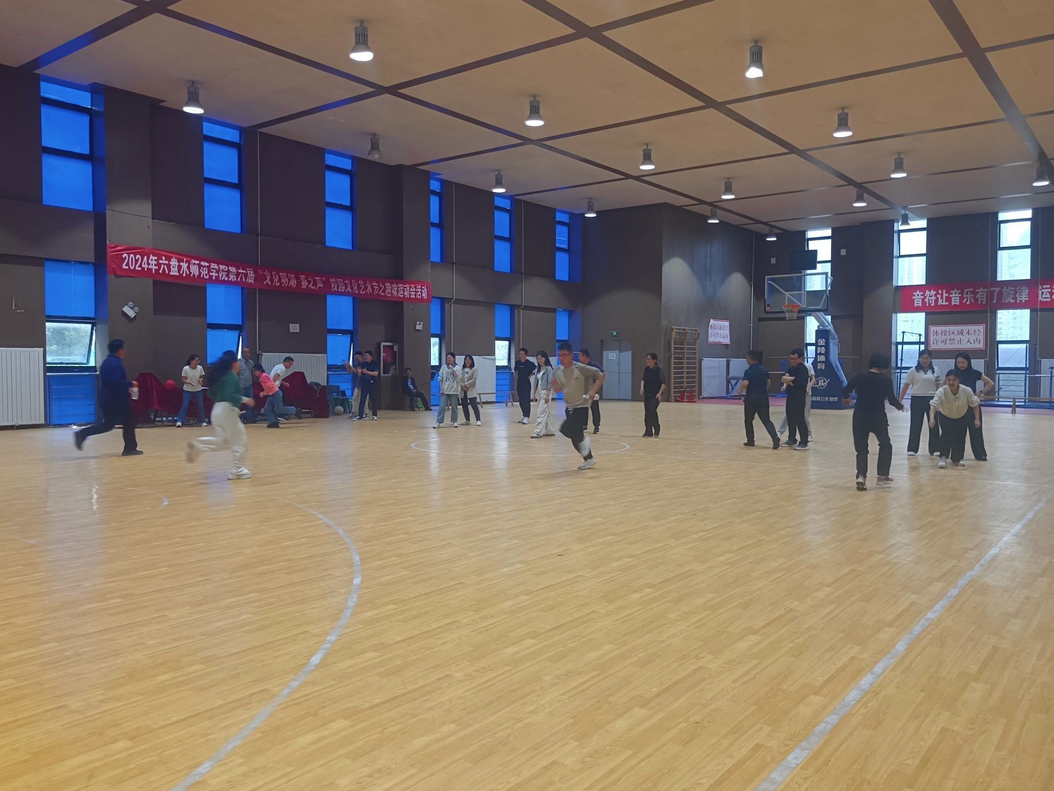 本次活动项目共计四个,折返换物接力赛,团队胯下篮球,折返跳绳接力赛,气球足球。活动过程中,老师们热情高涨,参与度高,每位教师都全身心的投入到了活动中,队与队之间展开了激烈的竞争,同时每个队内也进行了很好的协作配合,活动尾声阶段,老师们一起合唱了歌曲《团结就是力量》。