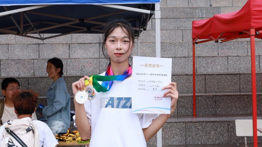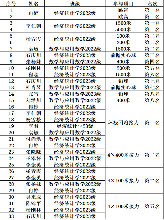 在本次运动会中,我院个别学生运动员成绩突出,其中,来自经济统计学2022级的李仁朝同学打破男子5000米和1500米长跑的学校最好成绩记录,来自经济统计学2022级的冉婷同学则打破女子跳高的学校最好成绩记录。