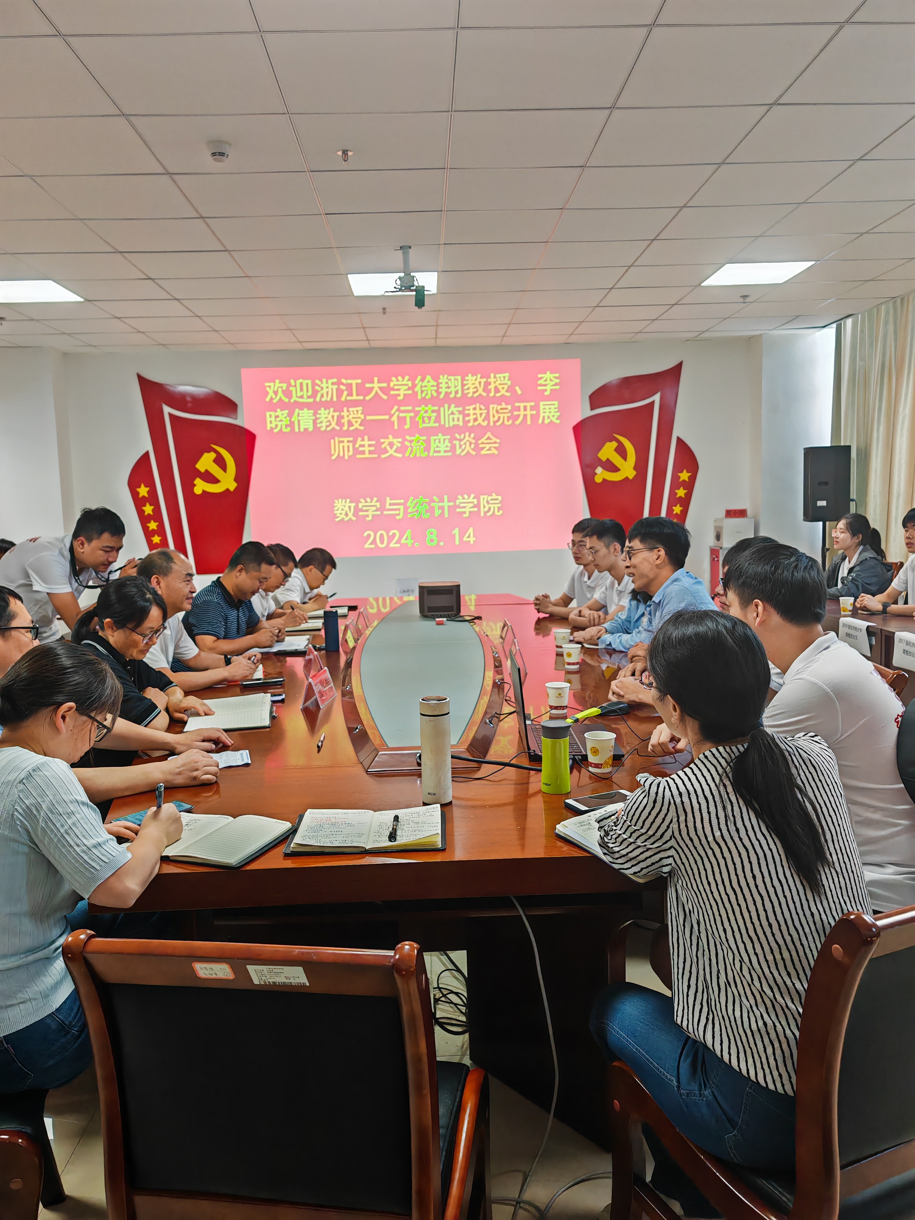 8月14日,浙江大学数学科学学院的徐翔教授和团委副书记李晓倩一行莅临我院进行师生交流。会议由院长宁宝权主持,党委书记杨光强、副书记张华伟、副院长王立威等出席,部分教师和学生也参与了此次会议。