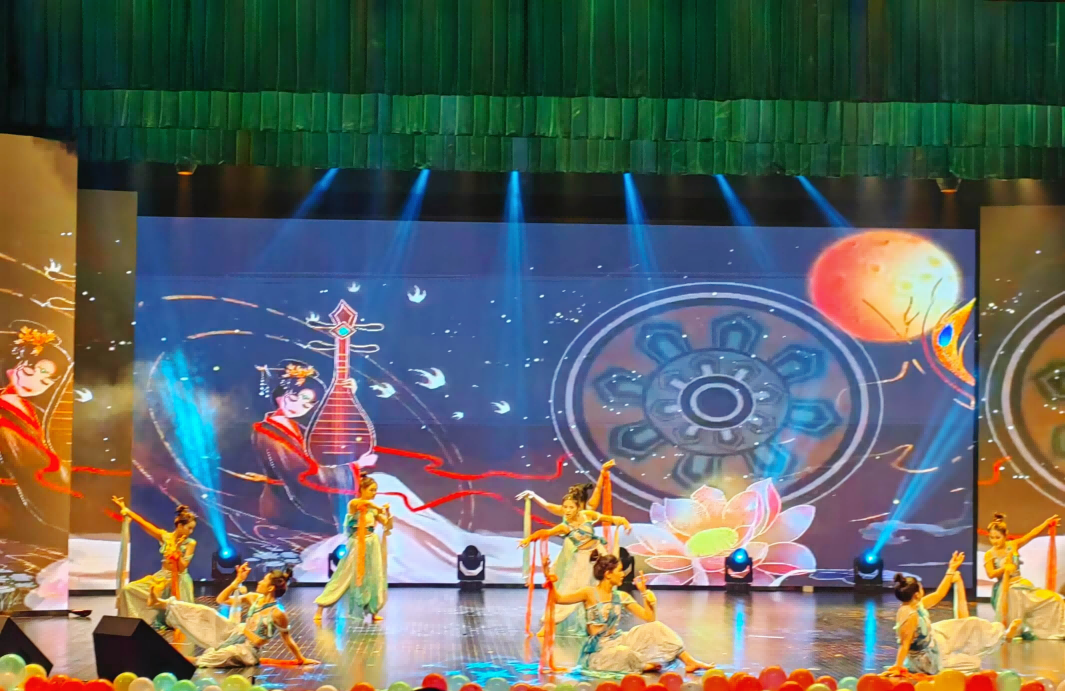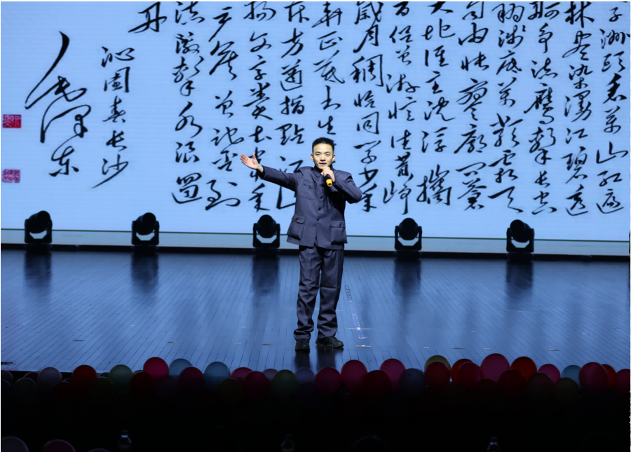 在节目表演环节,朗诵节目震撼人心:《觉醒年代》《读中国》《沁园春·长沙》等作品被演绎得掷地有声、饱含深情,深深触动了观众的心灵;歌曲表演同样精彩纷呈:《水星记》《想把我唱给你听》《那些你很冒险的梦》等曲目以及合唱《强国一代有我在》,同学们用歌声传递出对音乐的热爱与执着,彰显出青春的活力与激情;舞蹈表演亦别具魅力:《幸福的脚步》《飞天画壁》《我和我的祖国》等作品各具特色,舞出了别样的风采;退休教师高孝忠教授的二胡独奏《长相思》更是余音袅袅、韵味悠长,为整个活动增添了一抹独特的艺术韵味。