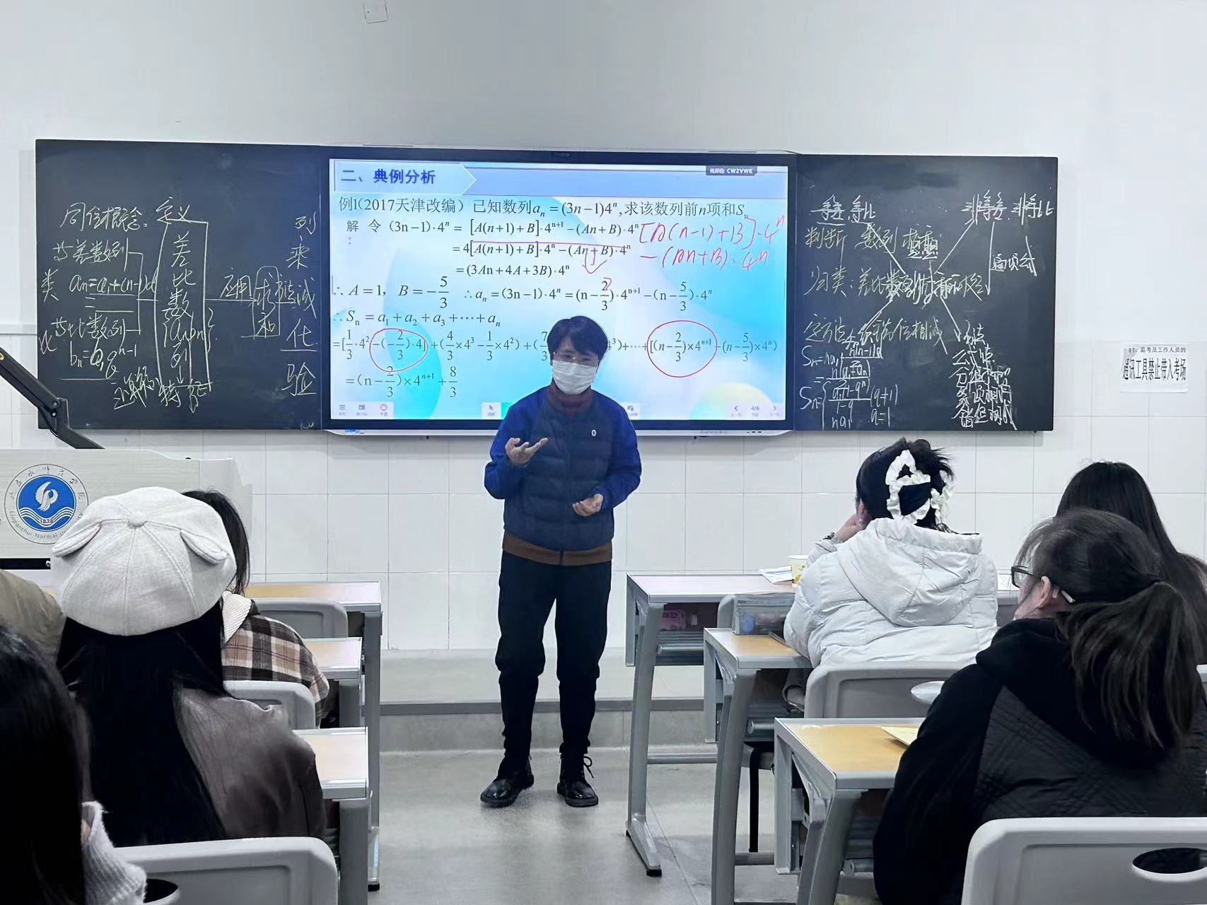 系列活动中,2022级学生金丹、2025级专升本学生王家娥与高中一线教师同台开展“等差数列前n项和公式”同课异构教学。两位同学分别以高斯求和故事、特殊数列规律探究为切入点,运用倒序相加法推导公式,通过小组讨论、阶梯式追问等方式引导学生自主探究,展现了扎实的专业基础与初步的教学实践能力。