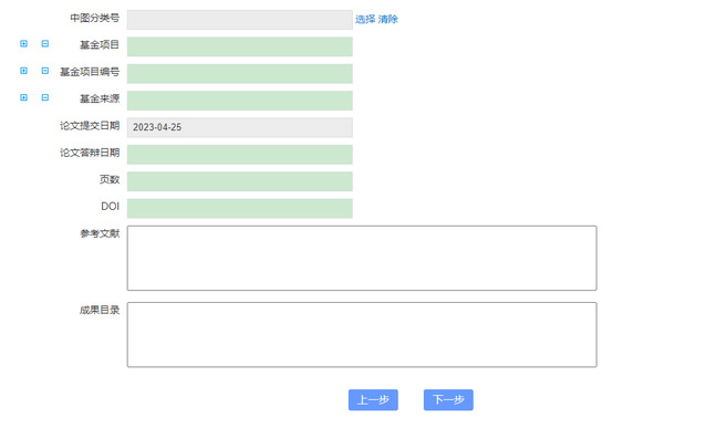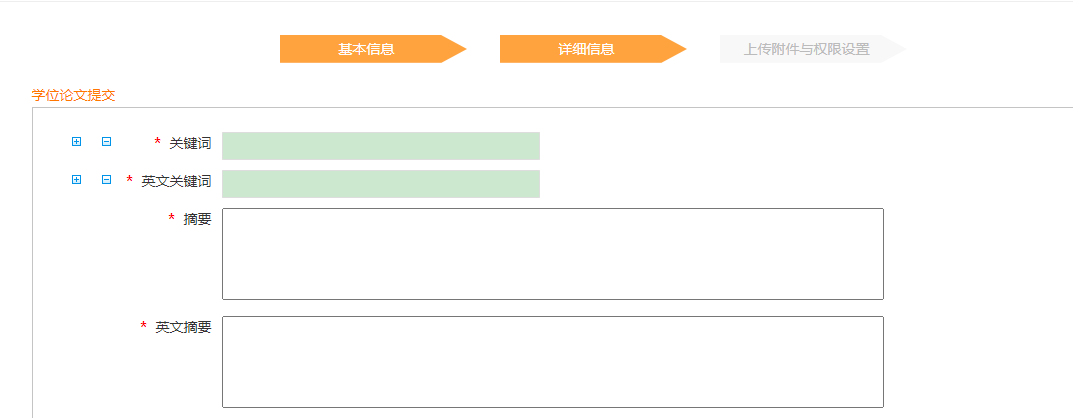 该页面需要填写详细信息,填写内容包括:关键词、英文关键词、摘要、英文摘要、中图分类号、基金项目、基金项目编号、基金来源、论文提交日期、论文答辩日期、页数、DOI、参考文献、成果目录。