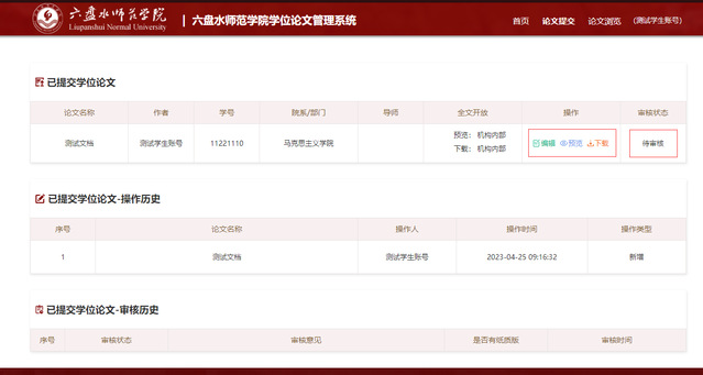 提交成功后,学生可再次进入该系统,输入账号、密码登录成功后,可查看已提交学位论文情况、已提交学位论文操作历史、已提交学位论文审核历史。其中可在“已提交学位论文”栏目中进行论文重新编辑、内容预览和下载。