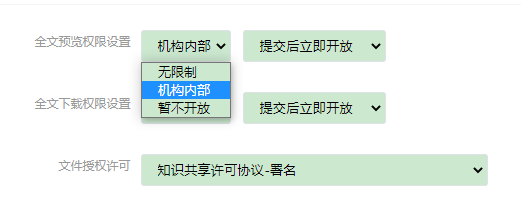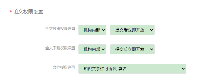 在论文权限设置模块中,全文预览权限设置和全文下载权限设置均选择“机构内部-提交后立即开放”、文件授权许可选择“知识共享许可协议—署名”,如下图所示。