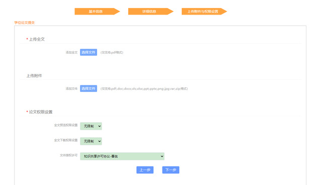 该页面可点击“上一步”修改基本信息,若该页面填写并确认无误后,可点击“下一步”进入“上传附件与权限设置”页面。