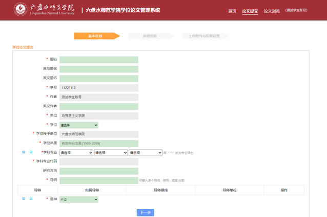 登录之后如下图所示:以“测试学生账号”为例,点击“论文提交”后将进入学位论文提交页面: