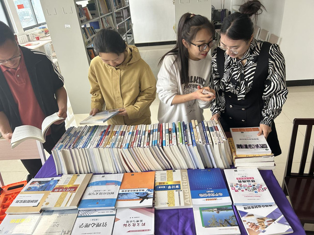 经管学院图书资料室,读者在浏览、交流展出图书内容