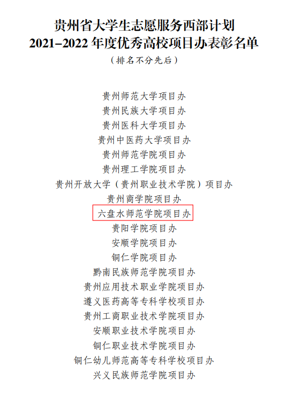 根据全国大学生志愿服务西部计划项目管理办公室印发的《关于2021年大学生志愿服务西部计划绩效考核优秀等次、不合格等次服务县和高校项目办名单的公示》和贵州省大学生志愿服务西部计划项目管理办公室印发的《关于表彰贵州省大学生志愿服务西部计划2021-2022年度优秀志愿者、优秀研究生支教团、优秀项目办的决定》,经省级项目办考核上报、全国项目办评审和公示,bat365西部计划项目办(校团委)获评贵州省大学生志愿服务西部计划2021-2022年度优秀高校项目办。