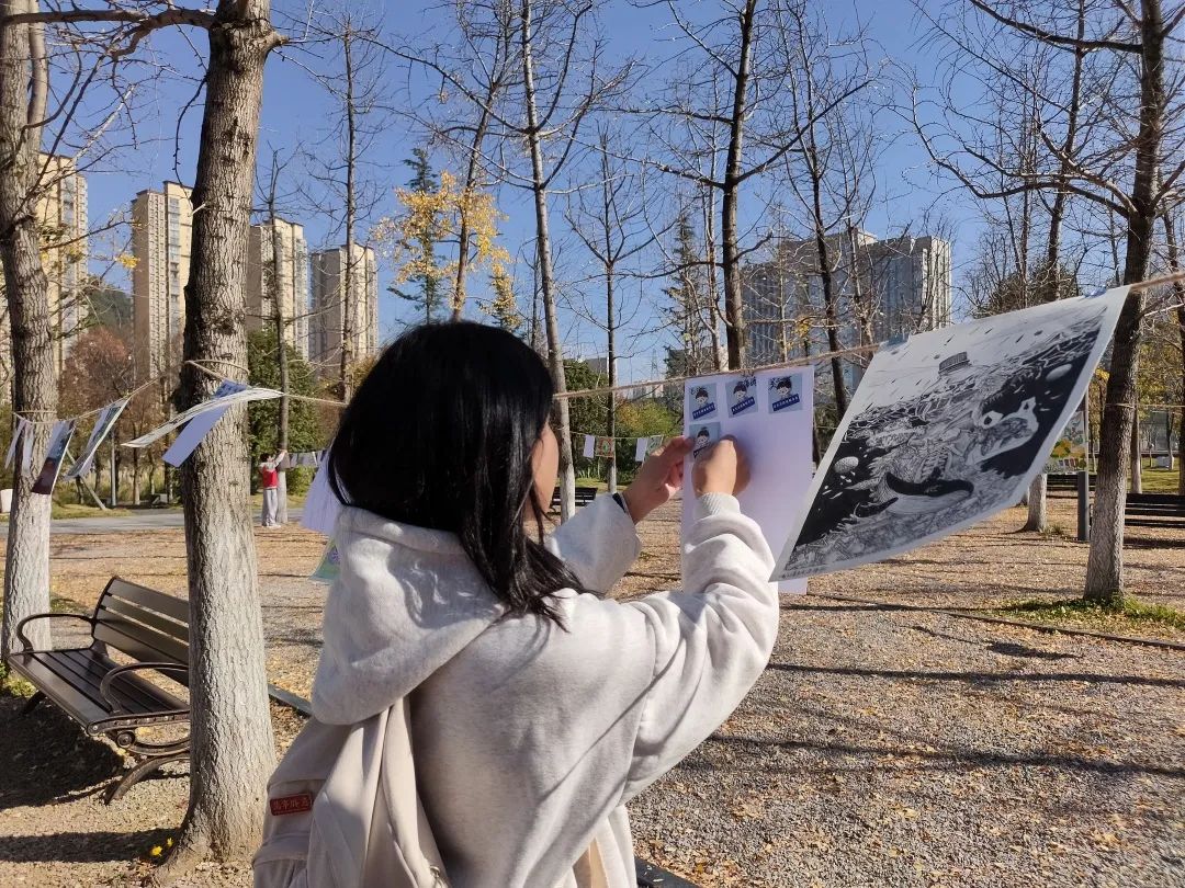 活动过程中,志愿者们耐心引导师生扫码登记并发放投票贴纸,让参与者在贴纸上写下姓名后将其贴在自己心仪的作品旁。随着志愿者们的热情宣传,活动反响良好,前来观展的师生络绎不绝,他们在书画作品前驻足观赏、细心品味,对参赛者的书画技艺予以肯定与鼓励,现场书香满溢、气氛活跃。