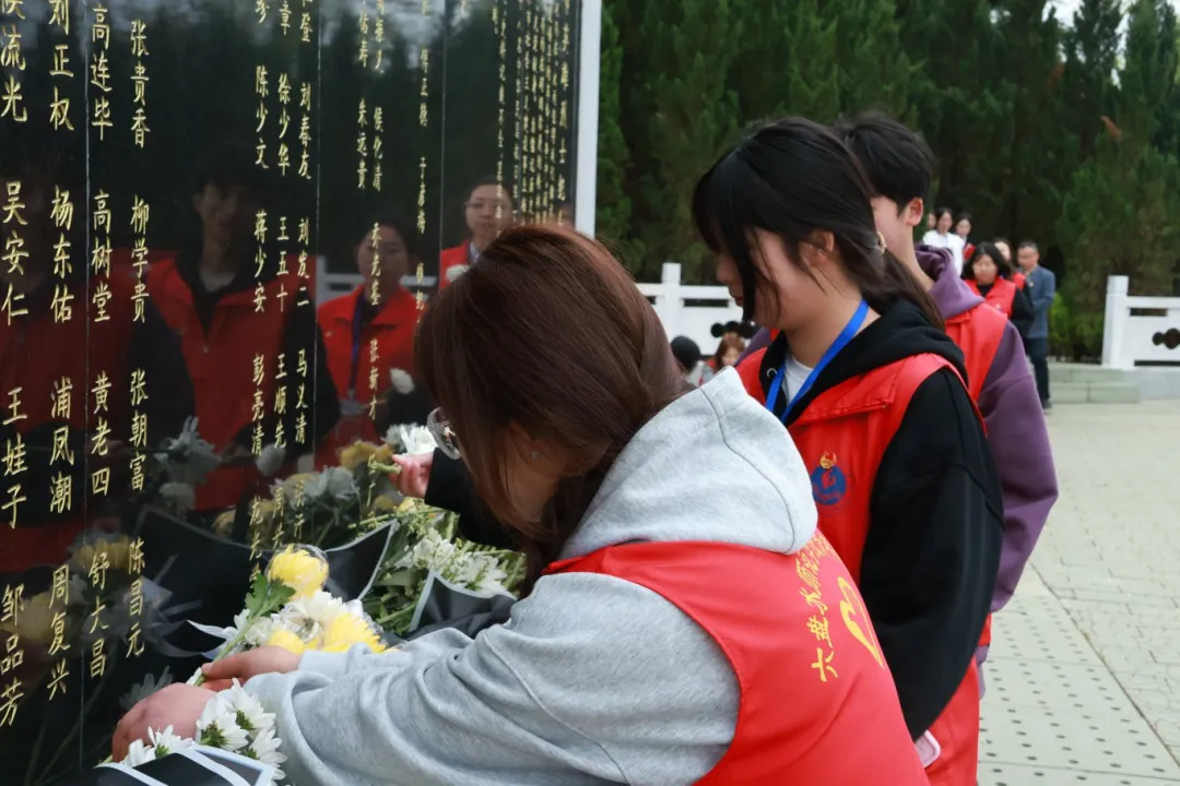 最后,师生们走到一座座烈士墓前敬献手中的菊花,以表对烈士们的哀思与崇敬。