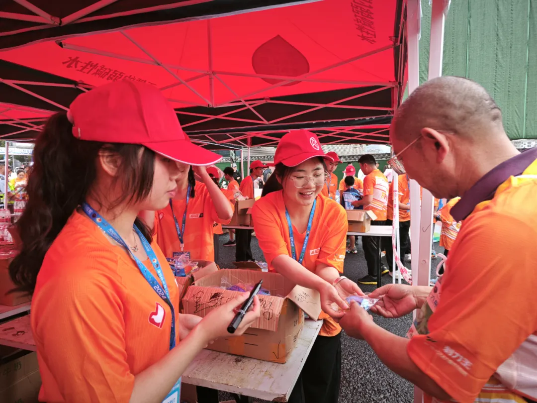志愿者们有的在补给站忙碌着,迅速为经过的选手备上清凉的饮用水,用鼓励的话语为选手们加油打气;有的志愿者在赛道旁维护秩序,确保比赛顺利进行,毫不懈怠。有的志愿者激动而又怀有敬意地为参赛选手挂牌,他们手捧奖牌微笑递向选手,这不仅是一份荣誉的传递,更是对选手坚持和拼搏的肯定。还有的志愿者在终点不停地为选手准备赛后物资,高强度地持续工作只是为了给参赛选手最完善贴心的服务。
