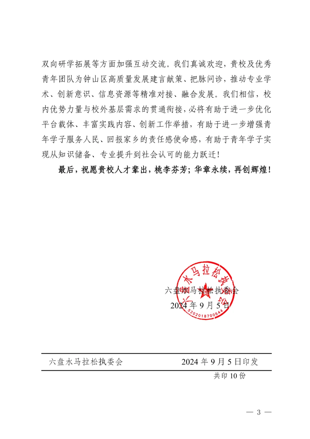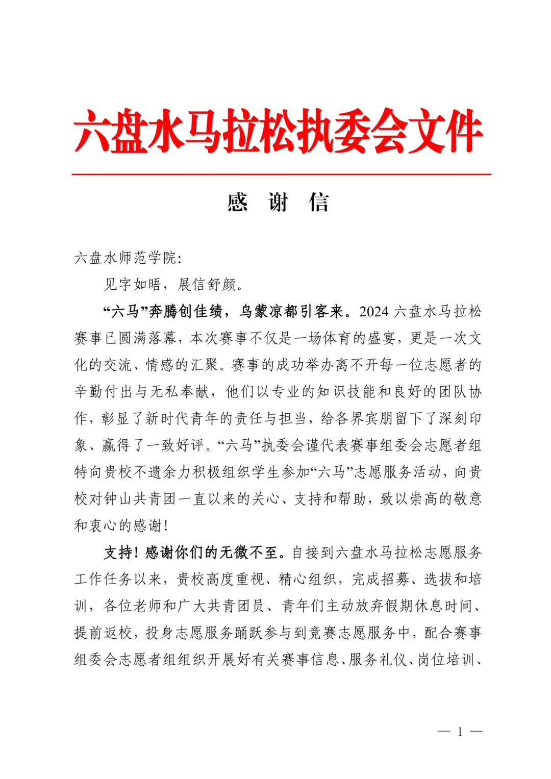近日,bat365收到了六盘水马拉松执委会的感谢信,执委会高度认可bat365在2024六盘水马拉松赛志愿服务中的服务管理工作,并对志愿者们的无私奉献和专业服务表示衷心的感谢。