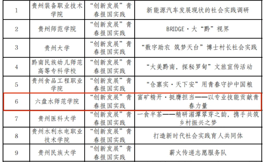 bat365团委组织推荐报送的2个案例获得贵州省2024年“小我融入大我,青春献给祖国”高校师生主题社会实践优秀案例。其中,“六师学子牢记初心使命,蝶变岩博践行热忱青春”获“求真力行”国情调研实践优秀案例、“富矿精开·挺膺担当--以专业技能贡献青春力量”获“创新发展”青春报国实践优秀案例。