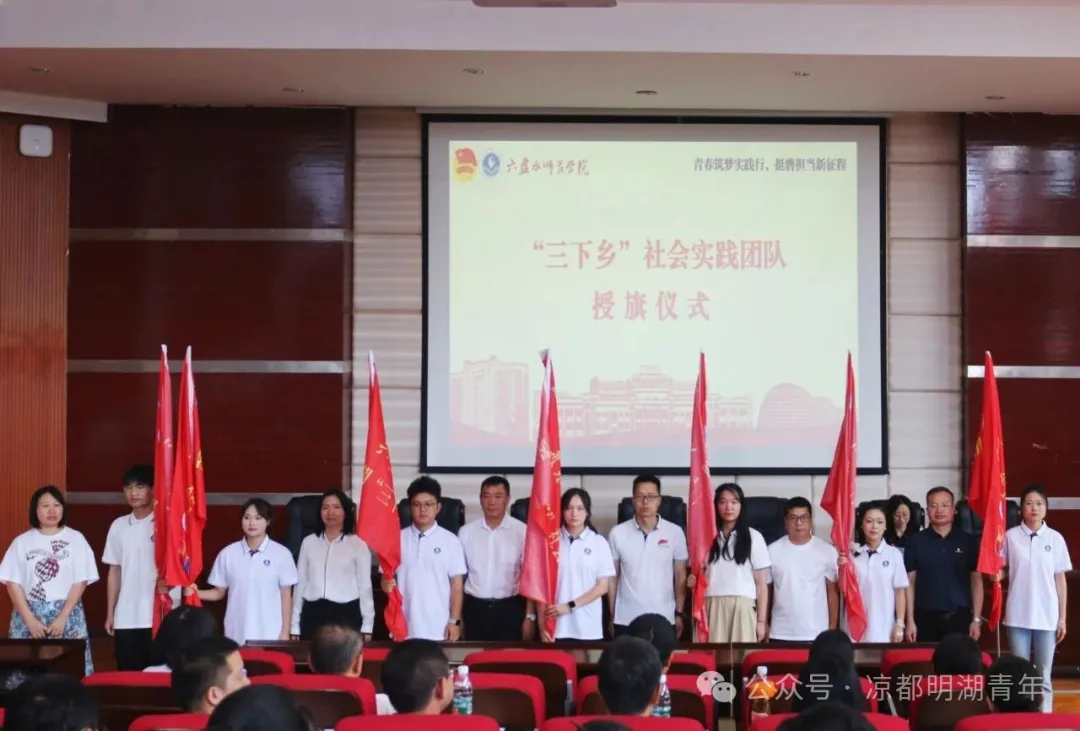 与会领导为即将启程的十四支实践团队代表授旗,希望同学们到群众中去,身处基层,展现青春的澎湃动能。