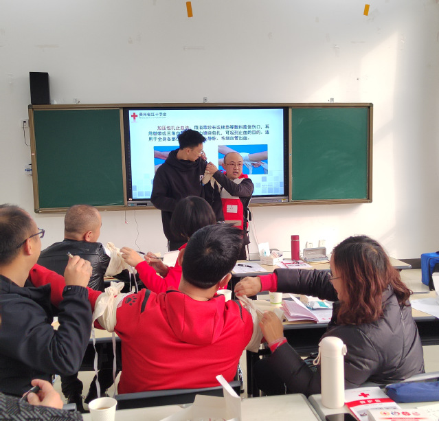 为加强师生自救互救专业技能,保障师生生命安全,11月6日,我院邀请钟山区红十字会在风雨操场103教室开展自救互救知识与技能培训,并倡议全校师生参与。我院全体教职工、部分学生及二级单位部分教职工参与了此次培训。