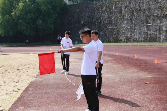 无处不在,维持比赛场地秩序。裁判员手中挥动的彩色令旗与蓝天相互映衬,一挥一收间保障比赛顺利进行。