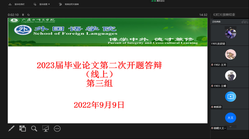 9月9日下午,外国语学院组织开展了英语2023届毕业论文第二次开题答辩。本科生导师担任评委,英语2023届第一次答辩未通过的同学参加。因疫情防控、学生在外实习等原因,此次开题答辩在线上举行。
