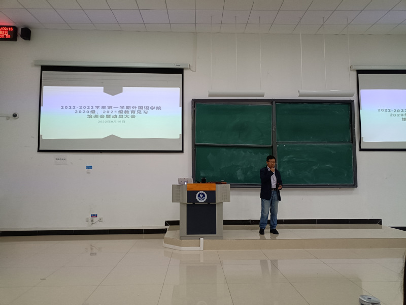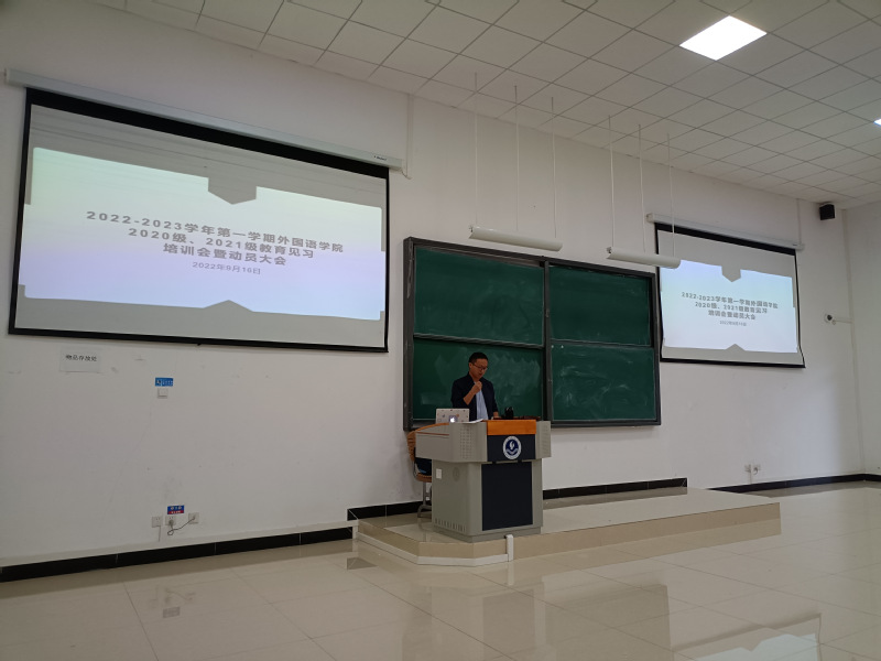 9月16日下午,外国语学院在勤学楼201教室举了英语2020级、2021级教育见习动员大会。动员大会由外国语学院副院长吴得禄主持。党委副书记蔡小雄、教学科研管理科科长王晓玥、英语系副主任汪阳、辅导员张中梅、2020级与2021级见习带队教师及2020级与2021级全体学生参加了此次见习动员大会。