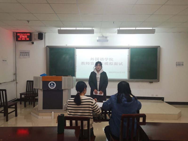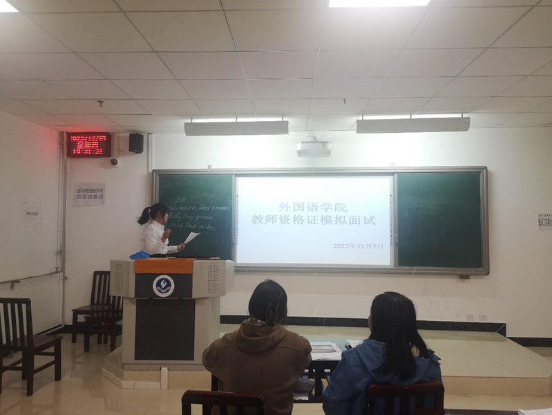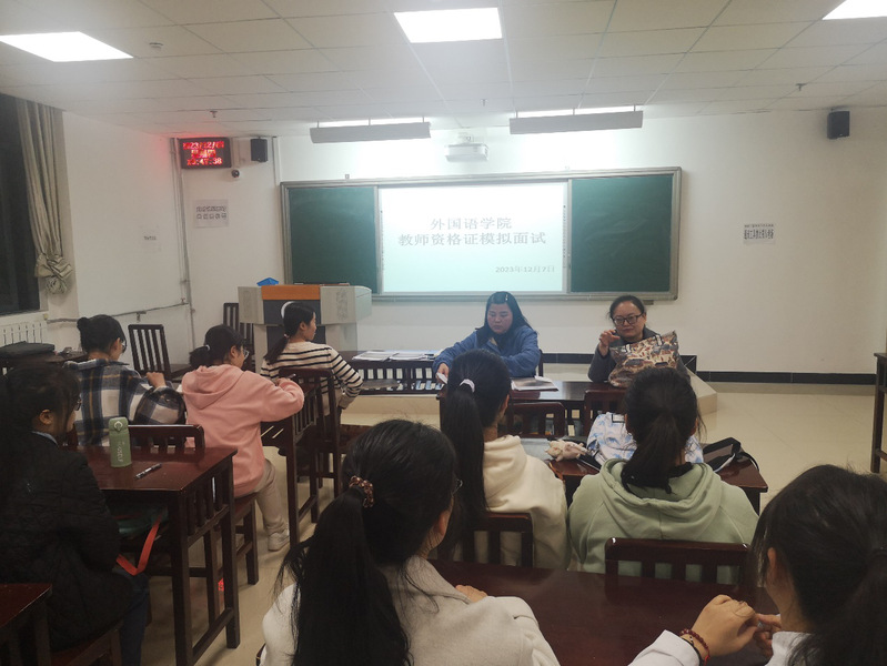为进一步提高人才培养质量,让英语专业学生提前熟悉教师资格证面试的基本流程,提升面试能力,提高教师资格证考试通过率,12月7日晚,我院在奥学楼三楼开展2023年下半年英语教师资格考试模拟面试活动。