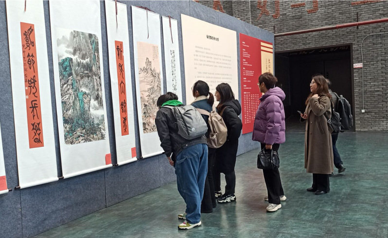 图为外国语学院教工支部党员欣赏书法和国画作品