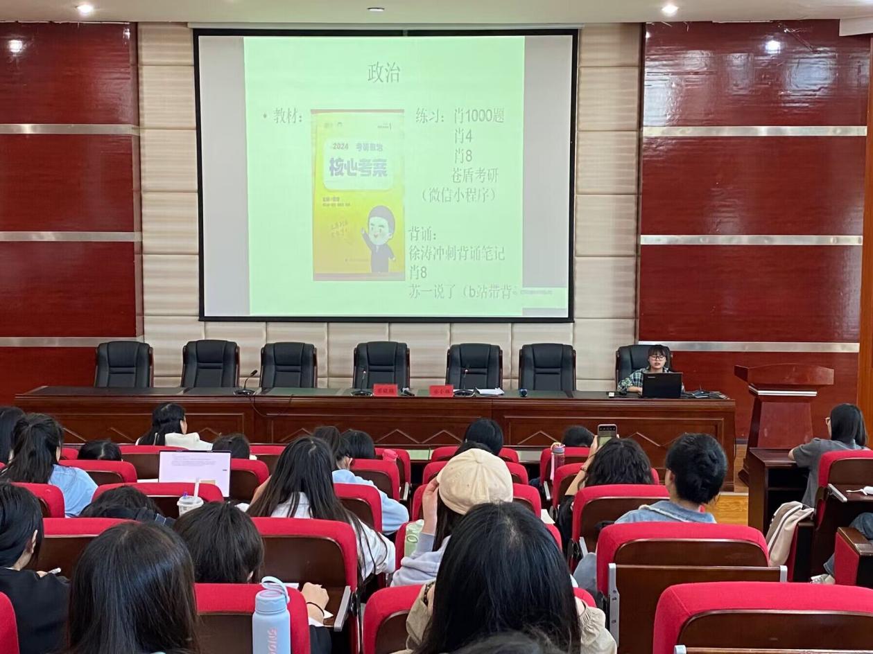 最后,蔡晓颖作了总结讲话。她指出,学风建设是一项常态化、持久性的基础工程和系统工程,涉及学风、教风和管理等重要内容,涉及学校、学院学生学习氛围和学习环境的方方面面,学院将久久为功,狠抓落实,切实加强学风建设,促进学院学风建设形成新气象。一是学风建设取得新成效。学生良好的学习和生活习惯养成,在上课和自习出勤率提高、学习成绩提高、英语专四、CET-6和计算机等级考试通过率提高、参加重大比赛获奖率提高、考研录取率提高、就业率提高上实现新的目标。二是考研和就业实现双提升。考研与就业是辩证统一的,而不是对立的,哪怕暂时没有考上,备考过程也是提高自身素质和为就业创造条件的过程,学院将以考研为抓手,通过考研促学风,促就业。最后,她寄语今年考上研究生的同学,考研上岸只是人生道路的一小步,希望他们珍惜宝贵的升学深造机会,谦虚谨慎,戒骄戒躁,在新的环境中再次脱颖而出,取得更大的成绩;也希望拟报考2025年研究生的同学都能实现自己的梦想、抵达想去的远方、成为更好的自己,早日成为可堪大用、能担重任的栋梁之才!(供稿/蒙文杰 张开芳 编辑校对/翟玙 审核/谭兰)