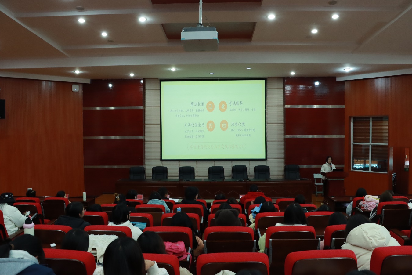大会第三环节,学院大四的优秀学生代表进行了经验分享。侯佳荣结合自己的学生干部经历与教资之路,为同学们分享了“成长与技巧的双重奏”,鼓励同学们积极奉献,勇于实践,用自己的付出和实践为未来发展添翼助力。高斯静结合自己参加挑战杯、英语专四备考、考研备考、担任英语爱好者协会会长等经历,鼓励同学们大胆创新,敢于超越自我,珍惜大学时光,不负韶华;敖银银结合自己的专业学习和成长感悟,勉励同学们树立高远志向,明确学习目标,养成阅读和思考的良好习惯,保持积极乐观的心态,勇敢地面对学习中的困难和挑战,努力实现自己的人生价值。