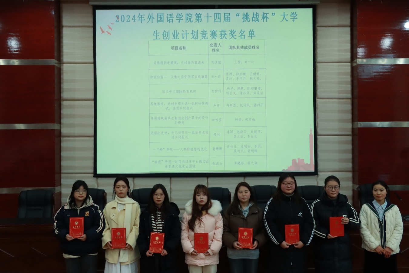 大会第二环节,学院领导和老师们为获得院级“学习标兵”、“劳动标兵”、“创新创业标兵”、“社会实践标兵”、“体育标兵”、“文明寝室”、“第一届诗词讲解大赛”、第六届“金话筒”主持人大赛、第六届“文华杯”中华诗文诵读比赛、第一届师范类专业“三字一话”应用能力大赛;院级和校级“三好学生”“优秀学生干部”,省级“三好学生”;2023-2024学年“校级奖学金”、“筑梦奖学金”、“国家励志奖学金”、“国家奖学金”;2024“外研社·国才杯”“理解当代中国”全国大学生外语能力大赛之国际传播综合能力赛、笔译、口译、演讲、短视频(贵州赛区决赛)、第十四届“挑战杯”大学生创业计划竞赛等荣誉的同学们颁奖。