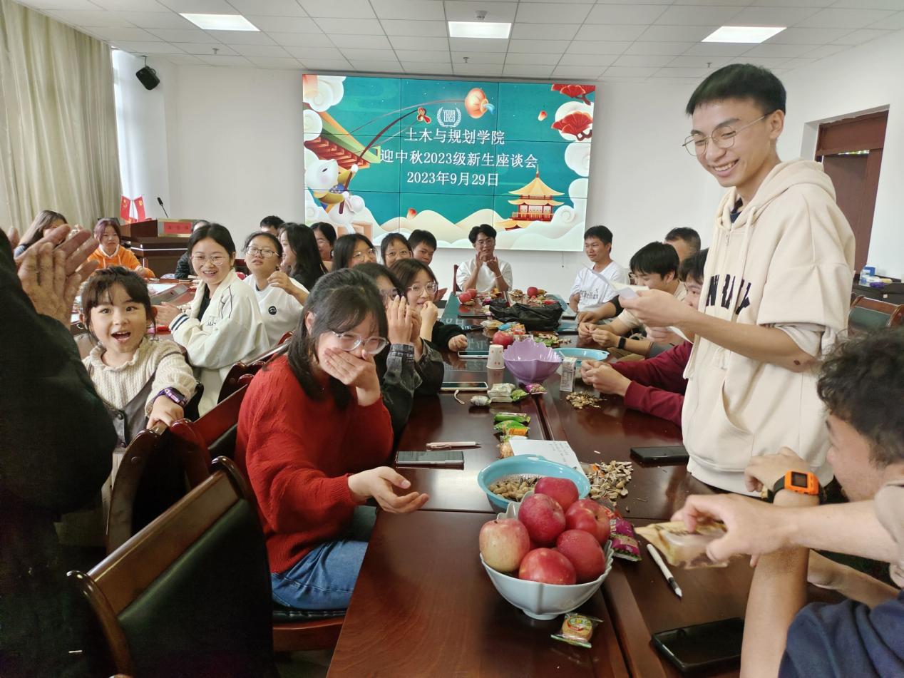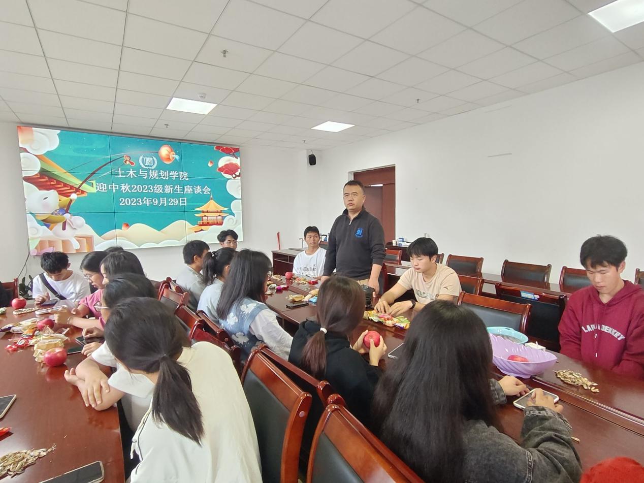 花香鸟语迎中秋,月圆人圆情更缘,在这人月两团聚的日子里,为了让留校的学子们也能快乐的过个中秋节,9月29日上午,土木与规划学院在奥学楼1107召开了迎中秋2023级新生座谈会,学院院长段磊,党委副书记刘海涛,副院长肖波,团委书记刘芳,城乡规划系副主任贾岩,辅导员龚璐璐老师以及2023级留校学生参加了本次座谈会。