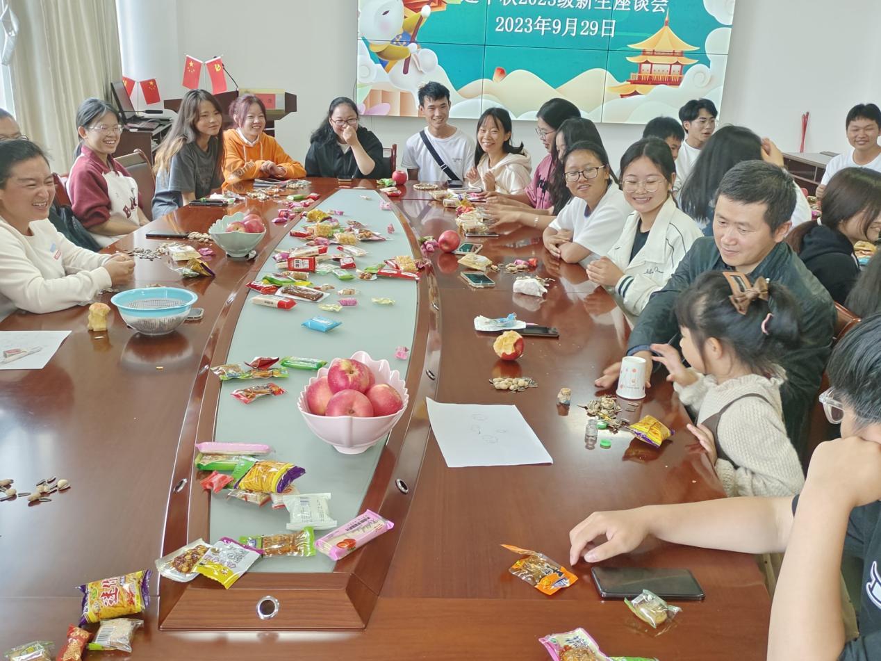 只为让同学们依旧体验到浓浓中秋味,月光所照,皆是故乡。座谈会上,老师为留校学生送上亲切慰问与祝福,与学生进行深入交流,关切地询问学生们近期的学习生活情况,鼓励学生要尽快适应大学生活,怀抱青春梦想,奋力扬帆启程。参会学生积极发言,介绍各自家乡中秋习俗,分享自己在校期间学习生活等方面情况,师生一起谈生活、话学习、提建议、说感悟,其乐融融,共度中秋!