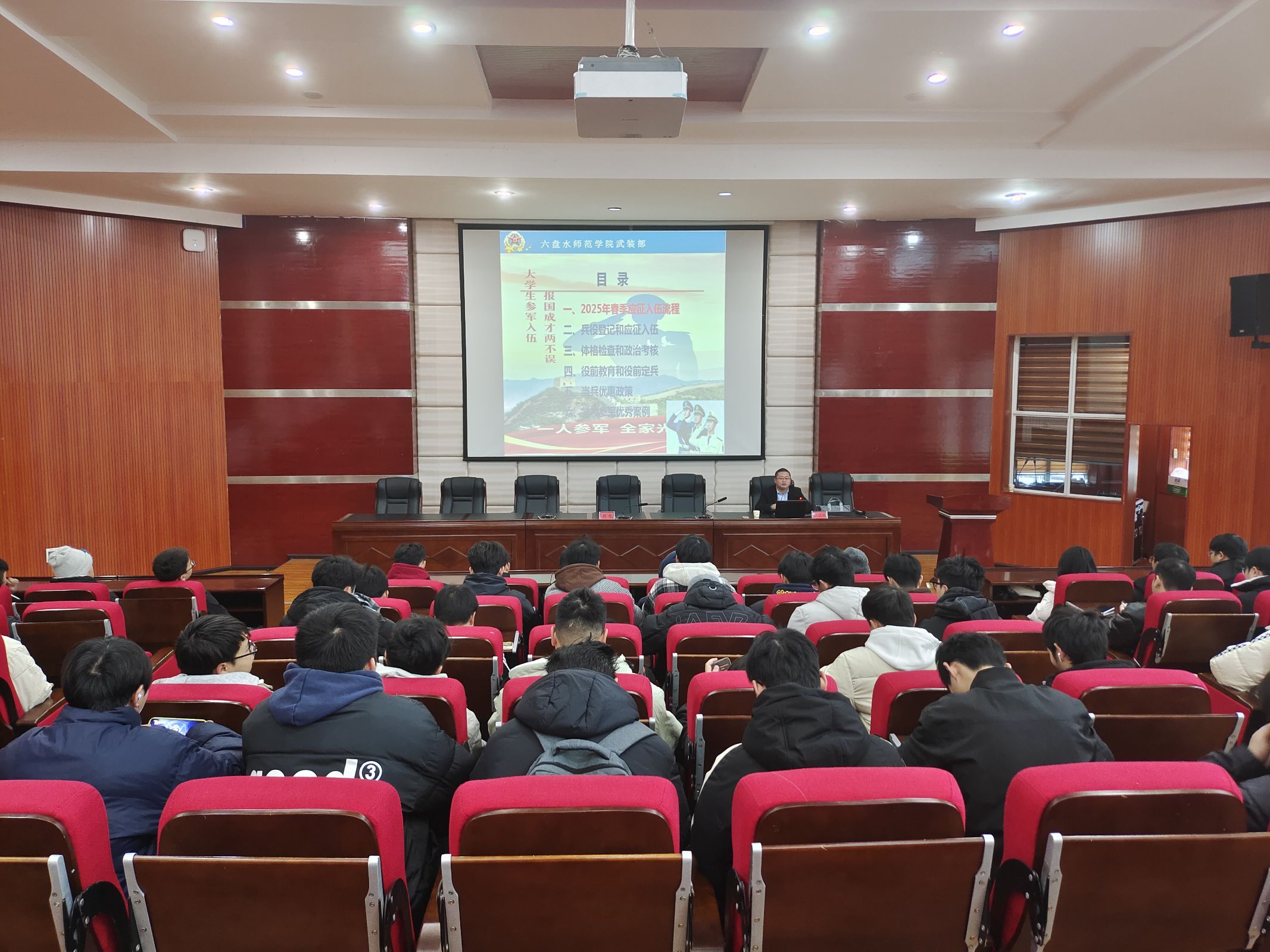 会上匡其羽组织同学们观看了2025年征兵宣传片《共赴百年之约》,并对应征入伍的流程和当兵优惠政策,向同学们进行了详细介绍。他还通过学校参军入伍同学的实际案例,讲述了他们从一名普通大学生蜕变为一名热血军人的成长历程。最后,他指出,大学生参军入伍既是国家发展的需要,也是大学生实现人生价值的需要,同学们要心怀家国梦想,积极响应国家的征兵号召,踊跃报名参军,到部队中施展才华,为国防事业贡献力量。