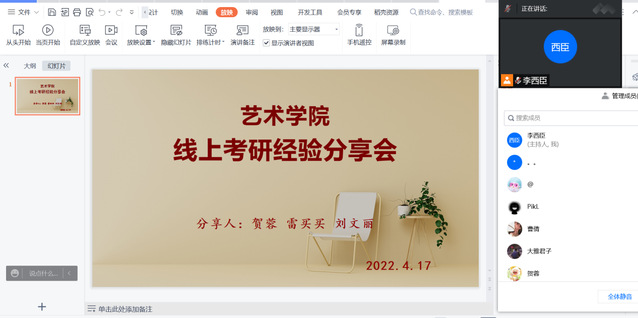 为帮助学生做好学业规划,激发学生考研的积极性,4月17日晚19点,我院举办线上考研经验分享会,邀请今年考取硕士研究生的美术学专业学生贺蓉、雷买买、刘文丽进行经验分享,分享会由李西臣副院长主持,100余名同学参加。
