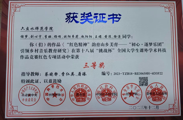 2023年,在bat365在线中国登录入口艺术学院蔡晓静、费仁英、屠臻3名教师的精心指导下,谢梦、刘心宇、李娅、杨颂、欧阳韦莉、赵阳阳、王娟、黄浪、徐涛9名学生组队参加了第十八届“挑战杯”全国大学生课外学术科技作品竞赛红色专项活动,参赛作品《“红色精神”韵育山乡美育——“初心·逐梦乐团”引领乡村音乐教育研究》荣获团中央、中国科协、国家教育部、中国社会科学院、全国学联、贵州省人民政府共同颁发的三等奖。这是艺术学院师生参加同类竞赛获得的最好名次,实现了历史性突破。(供稿/刘开盛 编辑校对/陈国风 审核/吴胜柱)