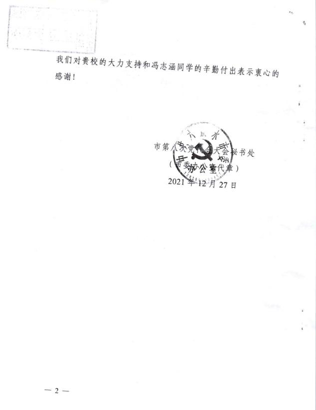 感谢信写道:中国共产党六盘水市第八次代表大会在筹备和召开期间,正值岁末年初,各项工作任务十分繁重,冯志涵同学在实习单位自愿延长实习时间,始终以饱满的工作热情和严谨的纪律作风投入到各项工作中,为大会的圆满成功作出了积极贡献。