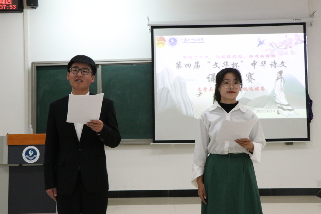 4月14日晚,文学与新闻学院在奥学楼106教室举行学校第四届“文华杯”诗文诵读大赛院级选拔赛,学院党委书记刘付华、副书记杜云、学生科(团委)副科长(副书记)王可凡和教师邹璇、何亮、杨杰担任评委,学生龙小燕、丁波主持。