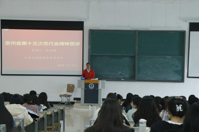 5月26日,在勤学楼101教室,文学与新闻学院党委书记龙尚国宣讲贵州省第十三次党代会精神,2019级汉语言文学2班、3班、4班全体同学到场聆听。